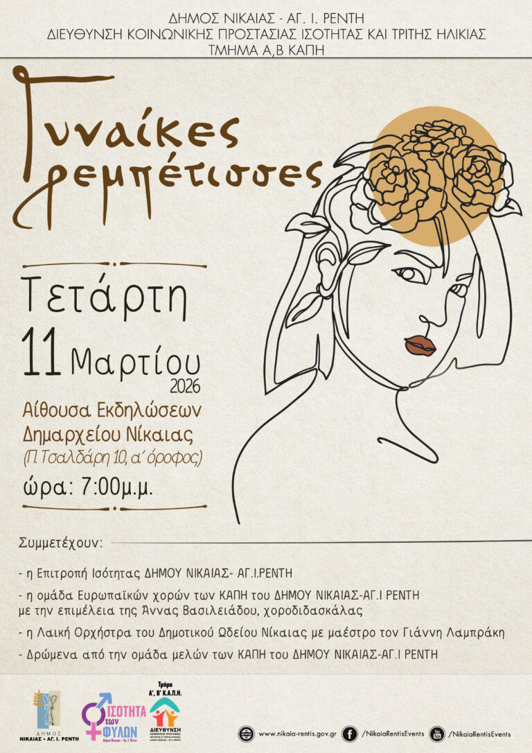 Με αφορμή την Παγκόσμια Ημέρα της Γυναίκας, η Διεύθυνση Κοινωνικής Προστασίας, Ισότητας και Τρίτης Ηλικίας, Τμήμα Α, Β ΚΑΠΗ Δήμου Νίκαιας-Αγίου Ιωάννη Ρέντη, διοργανώνει την εκδήλωση «Γυναίκες ρεμπέτισσες», αφιερωμένη σε σπουδαίες μορφές του ρεμπέτικου, όπως η Μαρίκα Νίνου και η Αγγέλα Παπάζογλου, που με τη φωνή και την παρουσία τους σημάδεψαν μια ολόκληρη εποχή.
