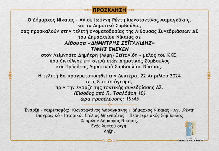 Σε αίθουσα «Δημήτρης Σεϊτανίδης» θα ονομαστεί η αίθουσα Δημοτικού Συμβουλίου Νίκαιας. Η τελετή ονοματοδοσίας θα πραγματοποιηθεί τη Δευτέρα 22 Απριλίου στις 7.40 το απόγευμα, πριν από την έναρξη της τακτικής συνεδρίασης του Δημοτικού Συμβουλίου. Σύντομο χαιρετισμό θα απευθύνει ο Δήμαρχος Νίκαιας-Αγ.Ι.Ρέντη Κωνσταντίνος Μαραγκάκης . Για τον αείμνηστο Δημήτρη (Μίμη) Σεϊτανίδη, μέλος του ΚΚΕ που διετέλεσε επί σειρά ετών Δημοτικός Σύμβουλος και Πρόεδρος Δημοτικού Συμβουλίου θα μιλήσει ο Στέλιος Μπενετάτος Περιφερειακός Σύμβουλος και πρώην Δήμαρχος Νίκαιας.