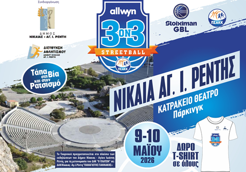 Ο Δήμος Νίκαιας – Αγίου Ιωάννη Ρέντη στηρίζει ενεργά και φέτος τη διεξαγωγή του Τουρνουά Μπάσκετ 3on3 allwyn Streetball «Τάπα στη Βία και τον Ρατσισμό», που διοργανώνει ο Πανελλήνιος Σύνδεσμος Αμειβομένων Καλαθοσφαιριστών – Καλαθοσφαιριστριών (ΠΣΑΚΚ) για 4η χρονιά στη Νίκαια, με στόχο την προώθηση του αθλητισμού και την ενίσχυση μηνυμάτων κατά της βίας και του ρατσισμού.