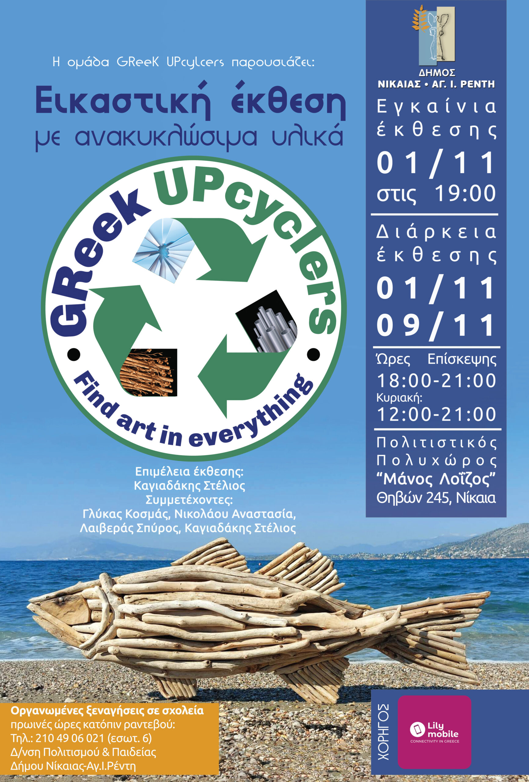 Εικαστική έκθεση με ανακυκλώσιμα υλικά παρουσιάζει η ομάδα GReek UPcyclers στον Πολιτιστικό Πολυχώρο «Μάνος Λοϊζος» (Θηβών 245) από 1η έως 9 Νοεμβρίου. Οι GReek UPcyclers είναι μια ομάδα τεσσάρων καλλιτεχνών που δημιουργούν εικαστικά και χρηστικά αντικείμενα αξιοποιώντας υλικά και αντικείμενα επανάχρησης. Με οδηγό τη φαντασία, την αισθητική και τον σεβασμό προς το περιβάλλον, μεταμορφώνουν ό,τι θεωρείται «άχρηστο» σε κάτι νέο, λειτουργικό και όμορφο. Τα εγκαίνια θα πραγματοποιηθούν το Σάββατο 1η Νοεμβρίου στις 19.00.