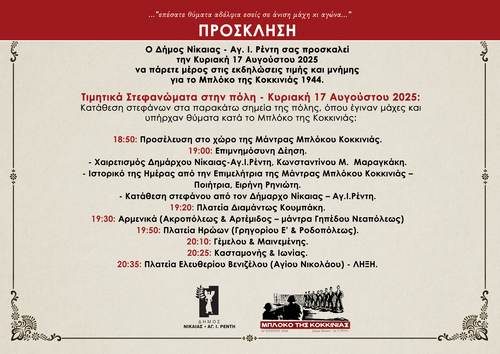 Ο Δήμος Νίκαιας – Αγ. Ι. Ρέντη διοργανώνει την Κυριακή 17 Αυγούστου 2025 εκδηλώσεις τιμής και μνήμης για το Μπλόκο της Κοκκινιάς του 1944, μία από τις πιο μαύρες σελίδες της νεότερης ελληνικής ιστορίας.