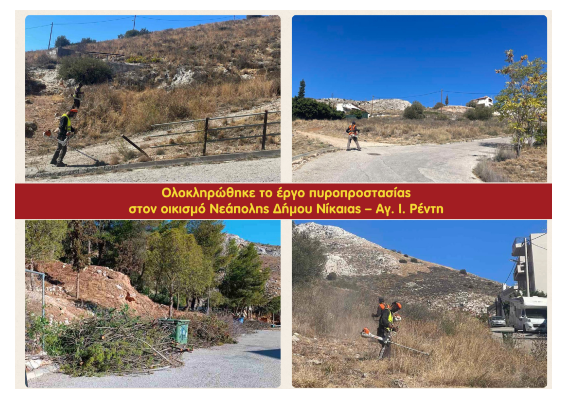 Ο Δήμος Νίκαιας – Αγ. Ι. Ρέντη ολοκλήρωσε έργο πυροπροστασίας συνολικής δαπάνης 40.885,24€, με χρηματοδότηση από το Πράσινο Ταμείο. Το έργο περιλάμβανε τη δημιουργία αντιπυρικής ζώνης μήκους 3.883,8 μέτρων και πλάτους 10 μέτρων κατά μέσο όρο, στα όρια του οικισμού Νεάπολης της Δημοτικής Ενότητας Νίκαιας – Αγ. Ι. Ρέντη, Περιφερειακής Ενότητας Πειραιά, αρμοδιότητας Δασαρχείου Πειραιά. Η ζώνη κατασκευάστηκε σε μέγιστη απόσταση 10 μέτρων από τα όρια του οικισμού και οι εργασίες περιελάμβαναν καθαρισμό από ξερά χόρτα και κλαδιά σε περιοχές γύρω από αυτόν.