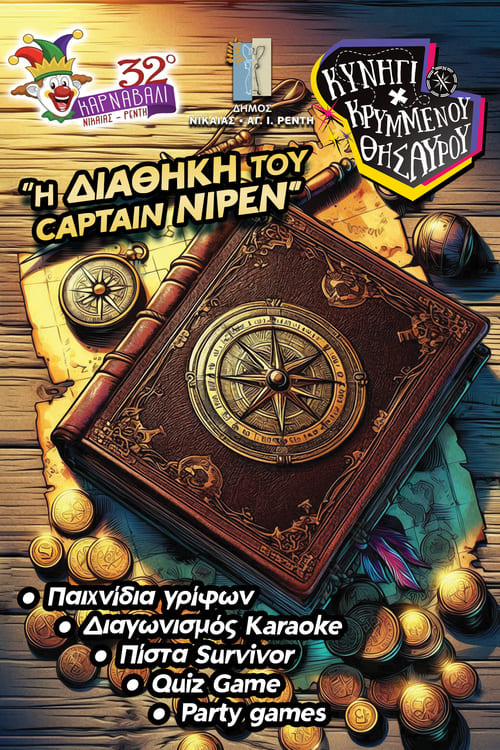 Ο Δήμος Νίκαιας,-Αγίου Ιωάννη Ρέντη συνεχίζει την αποκριάτικη παράδοση και προσκαλεί μικρούς και μεγάλους στο Κυνήγι Κρυμμένου Θησαυρού 2026, έναν θεσμό που εδώ και 25 χρόνια γεμίζει την πόλη με ζωντάνια, φαντασία και χαμόγελα. Με τίτλο «Η Διαθήκη του Κάπτεν Νιρέν», το φετινό παιχνίδι υπόσχεται νέες προκλήσεις, συναρπαστικές αποστολές και αξέχαστες εμπειρίες.