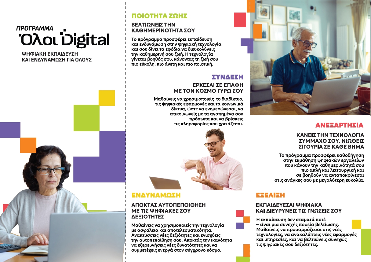 μπορούν να επισκέπτονται την πλατφόρμα του προγράμματος https://oloidigital.gr ή να απευθύνονται στη Διεύθυνση Κοινωνικής Προστασίας Ισότητας και Τρίτης Ηλικίας Τμήμα Α’, Β’ ΚΑΠΗ τηλ. 2131301935, 2104957145.