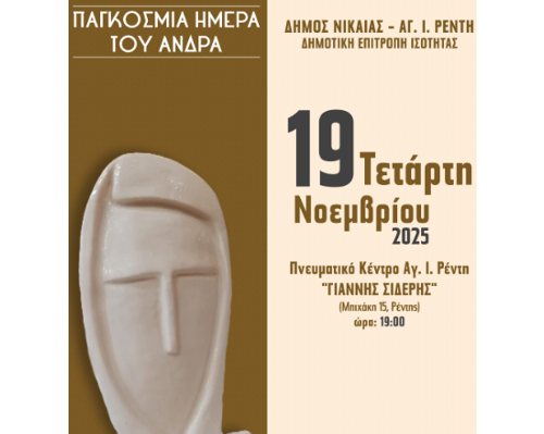 Η Δηµοτική Επιτροπή Ισότητας Νίκαιας Αγ. Ι. Ρέντη διοργανώνει εκδήλωση αφιερωµένη στην Παγκόσµια Ηµέρα του Άνδρα «∆εν είµαστε ίδιοι, είµαστε όµως ίσοι», την Τετάρτη 19 Νοεµβρίου στις 19:00, στο Πνευµατικό Κέντρο Αγ. Ι. Ρέντη «Γιάννης Σιδέρης» (Μπιχάκη 15). Συµµετέχει η Χορωδία Νίκαιας.