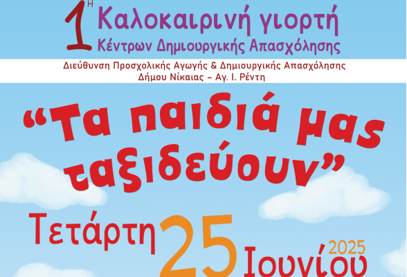 Την 1η Καλοκαιρινή Γιορτή ετοιμάζουν τα Κέντρα Δημιουργικής Απασχόλησης Δήμου Νίκαιας – Αγ. Ι. Ρέντη για να αποχαιρετήσουν τη σχολική χρονιά που ολοκληρώνεται. Την Τετάρτη 25 Ιουνίου στις 19:00, στο Ανοιχτό Θέατρο «Μίκης Θεοδωράκης» (Νάξου & Σταυράκη, Αγ.Ι. Ρέντης), οι μικροί μαθητές των ΚΔΑΠ δίνουν ραντεβού με τη φαντασία και τη δημιουργία. Τα παιδιά μας ταξιδεύουν και «Με Πυξίδα τα Όνειρα, Σαλπάρουμε για Καλοκαιρινές Περιπέτειες» με τη φετινή εκδήλωση να υπόσχεται ένα ταξίδι γεμάτο χρώμα, μουσική, θεατρικά δρώμενα και χορό. Τη διοργάνωση έχει αναλάβει η Διεύθυνση Προσχολικής Αγωγής & Δημιουργικής Απασχόλησης.